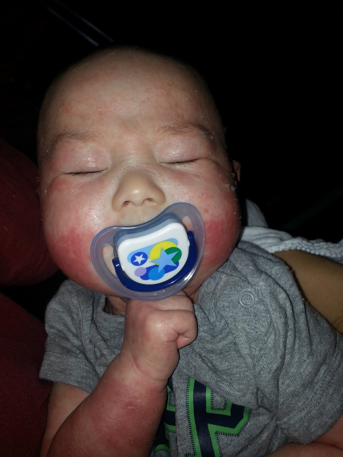 April 2014, we were at the beach and you can still see his skin not completely restored, his cheeks took a VERY long time to heal, arms and legs rashes would come and go.